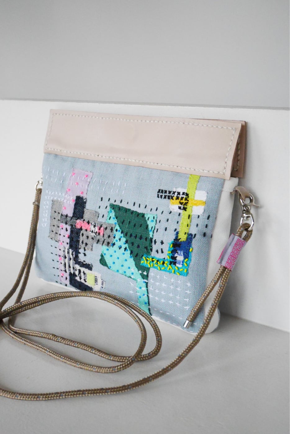 Materials: linen fabric, canvas, glass beads, leather, original rope
