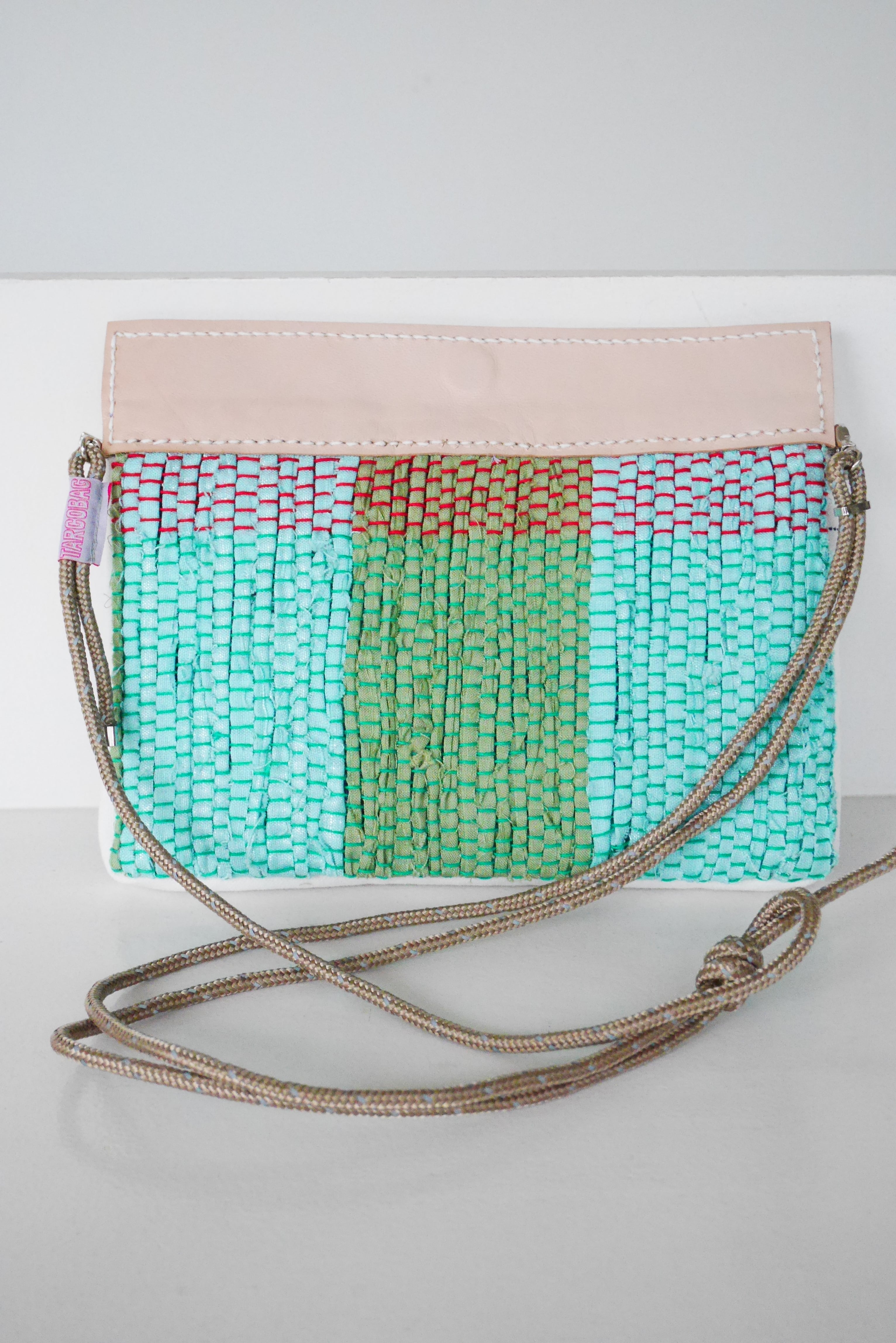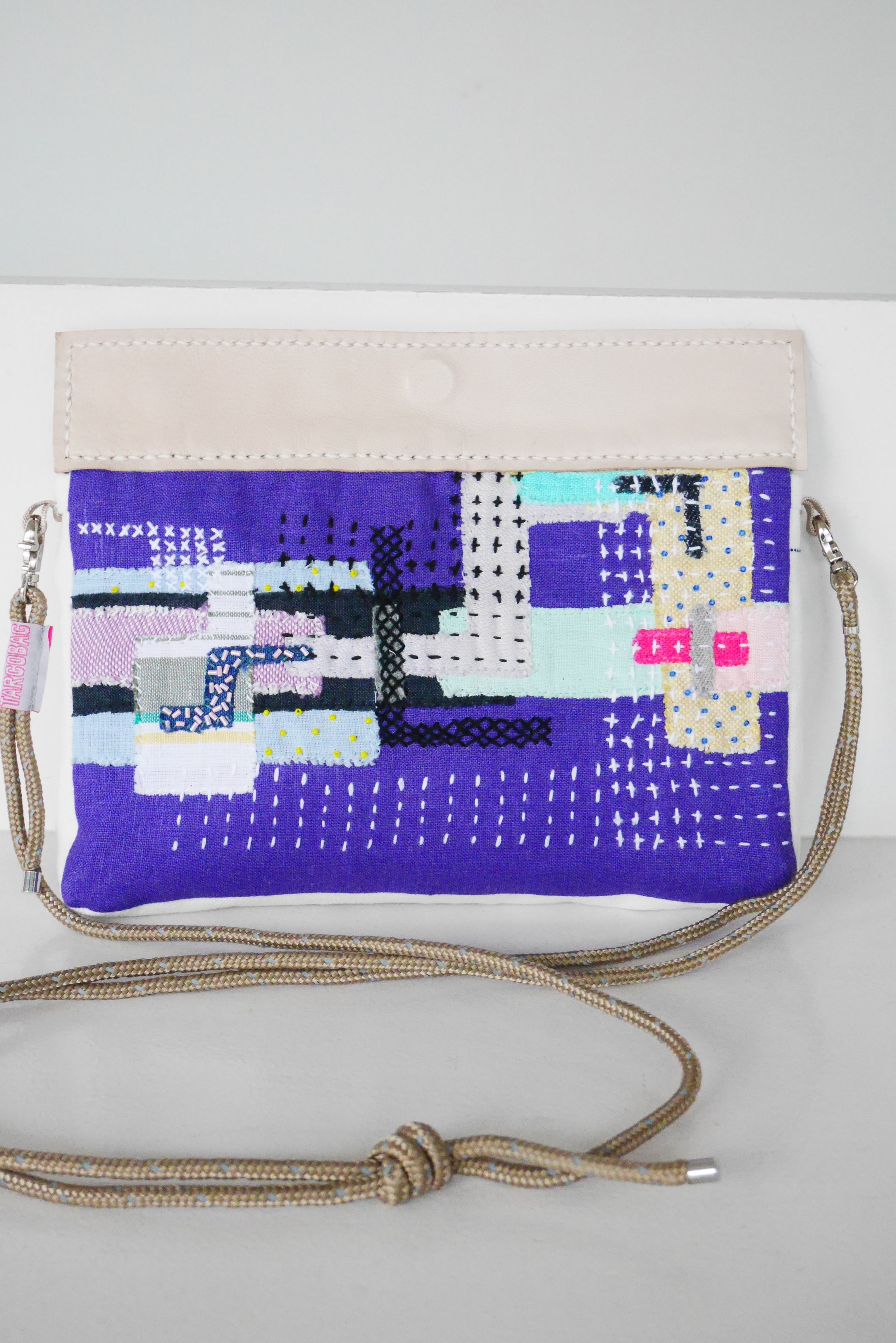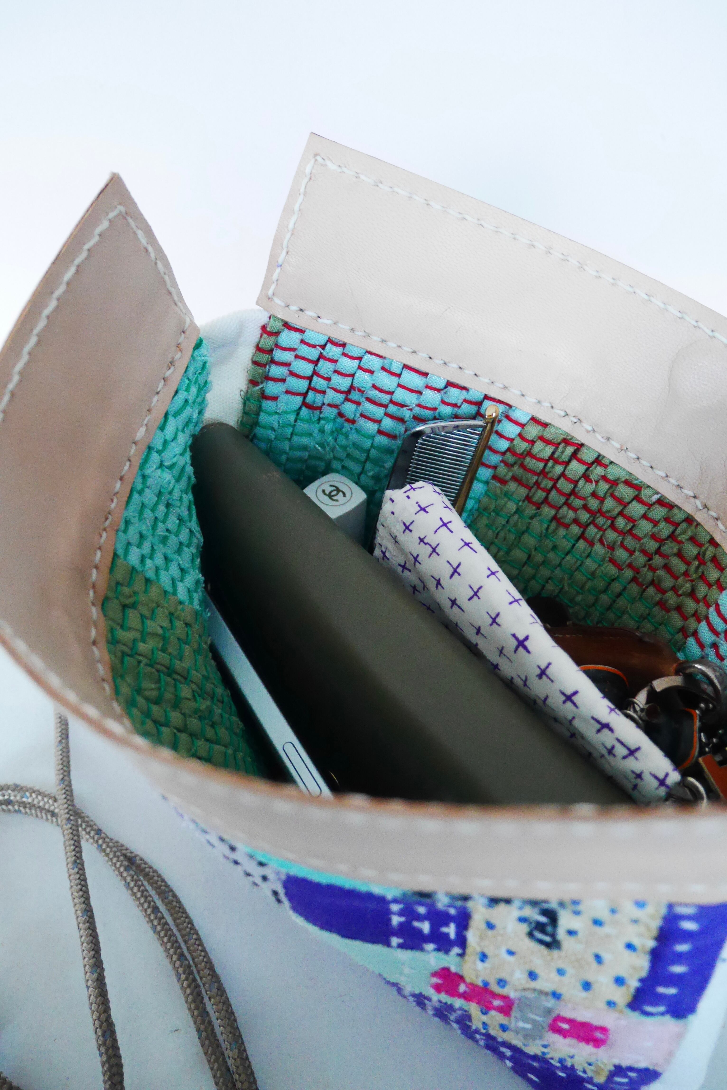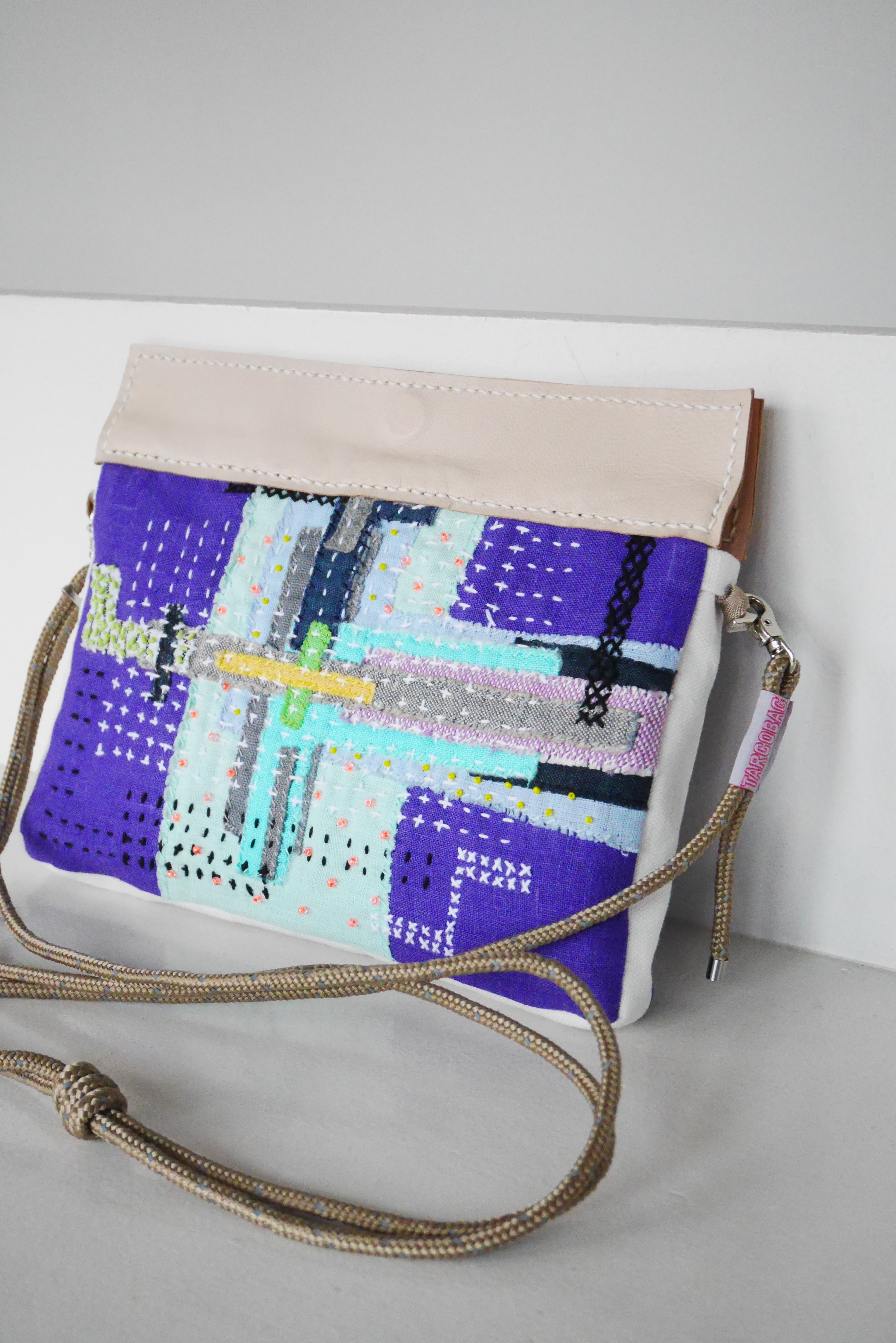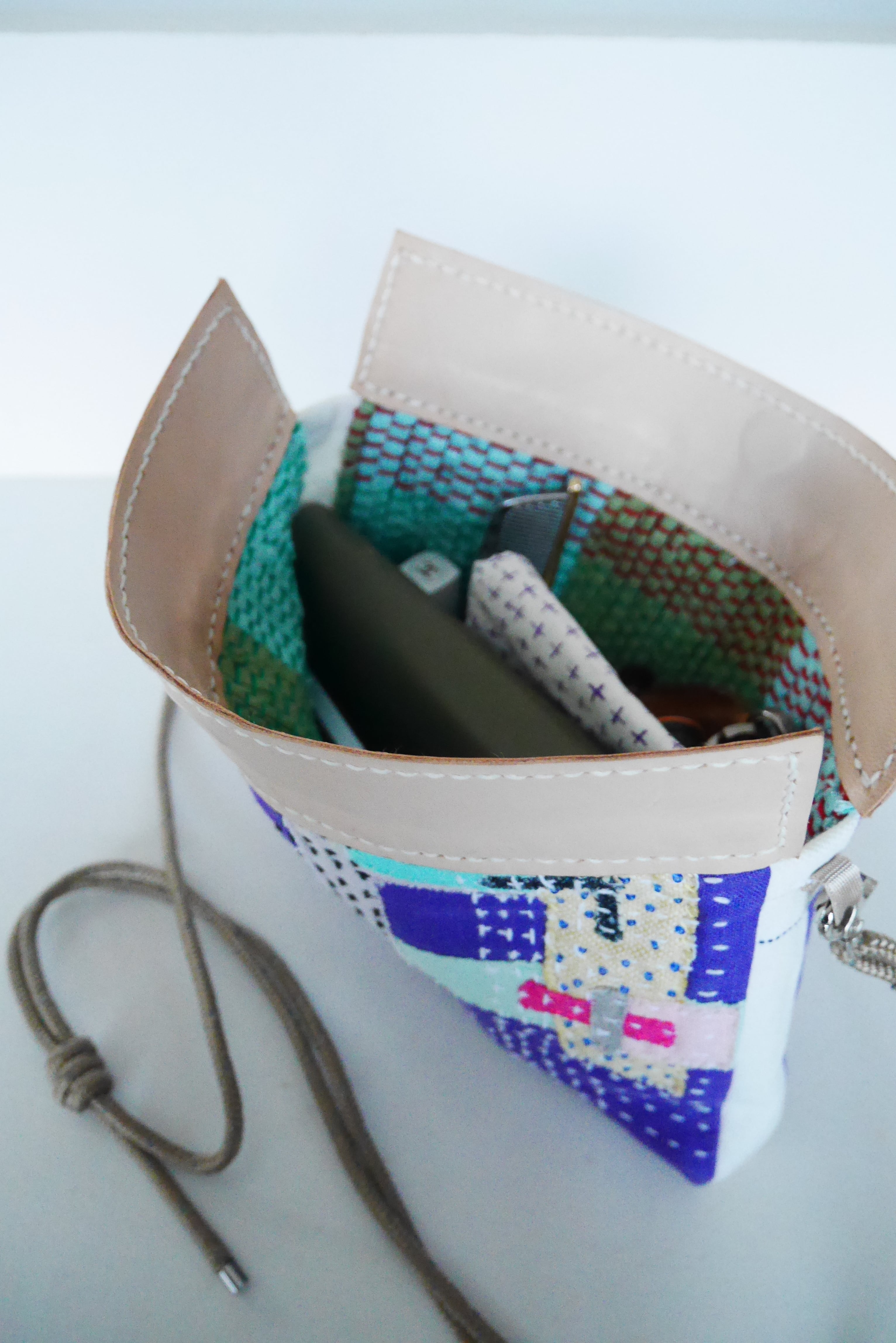Materials:linen fabric(reversible, handwoven), canvas, leather, glass beads, original rope