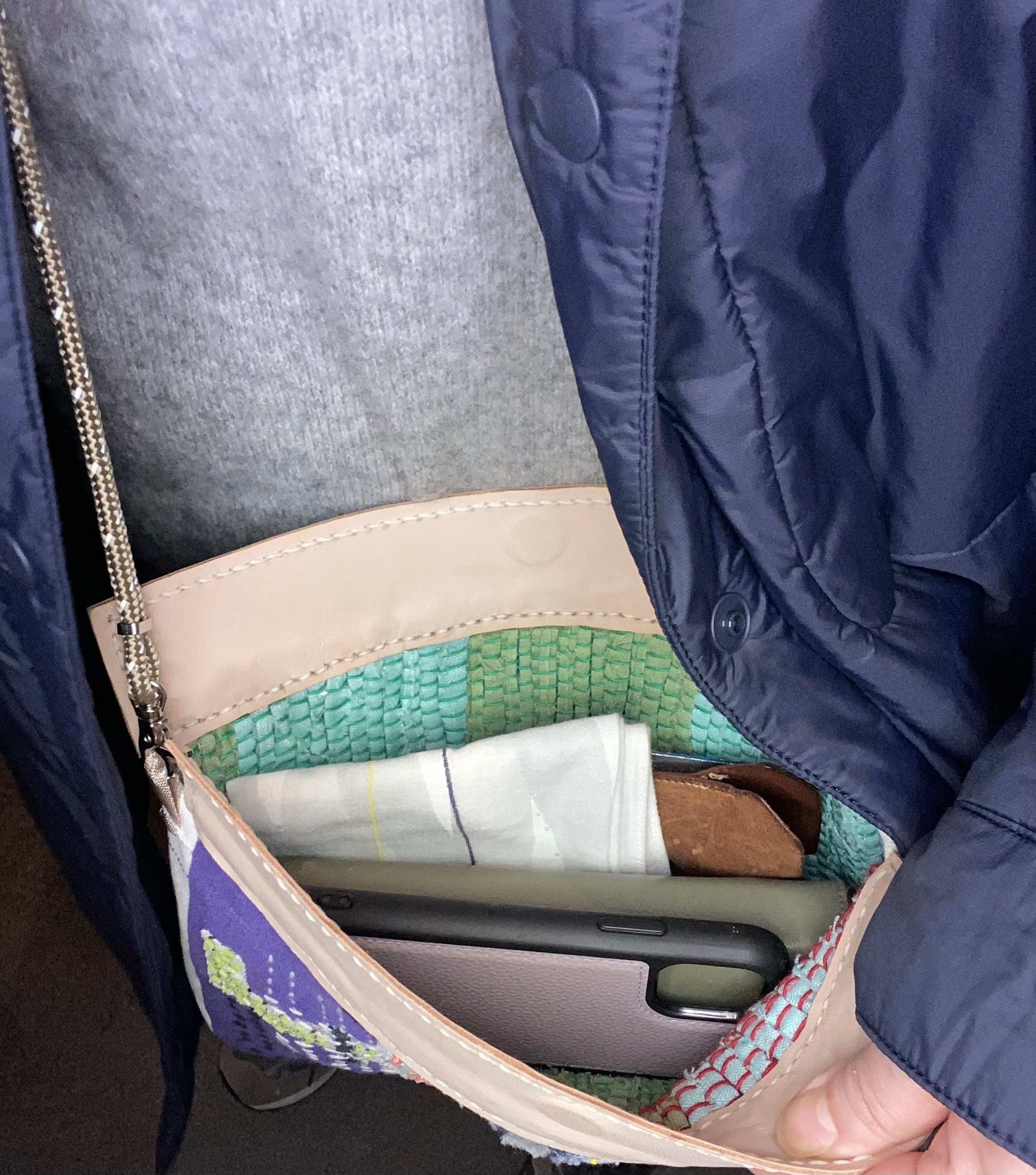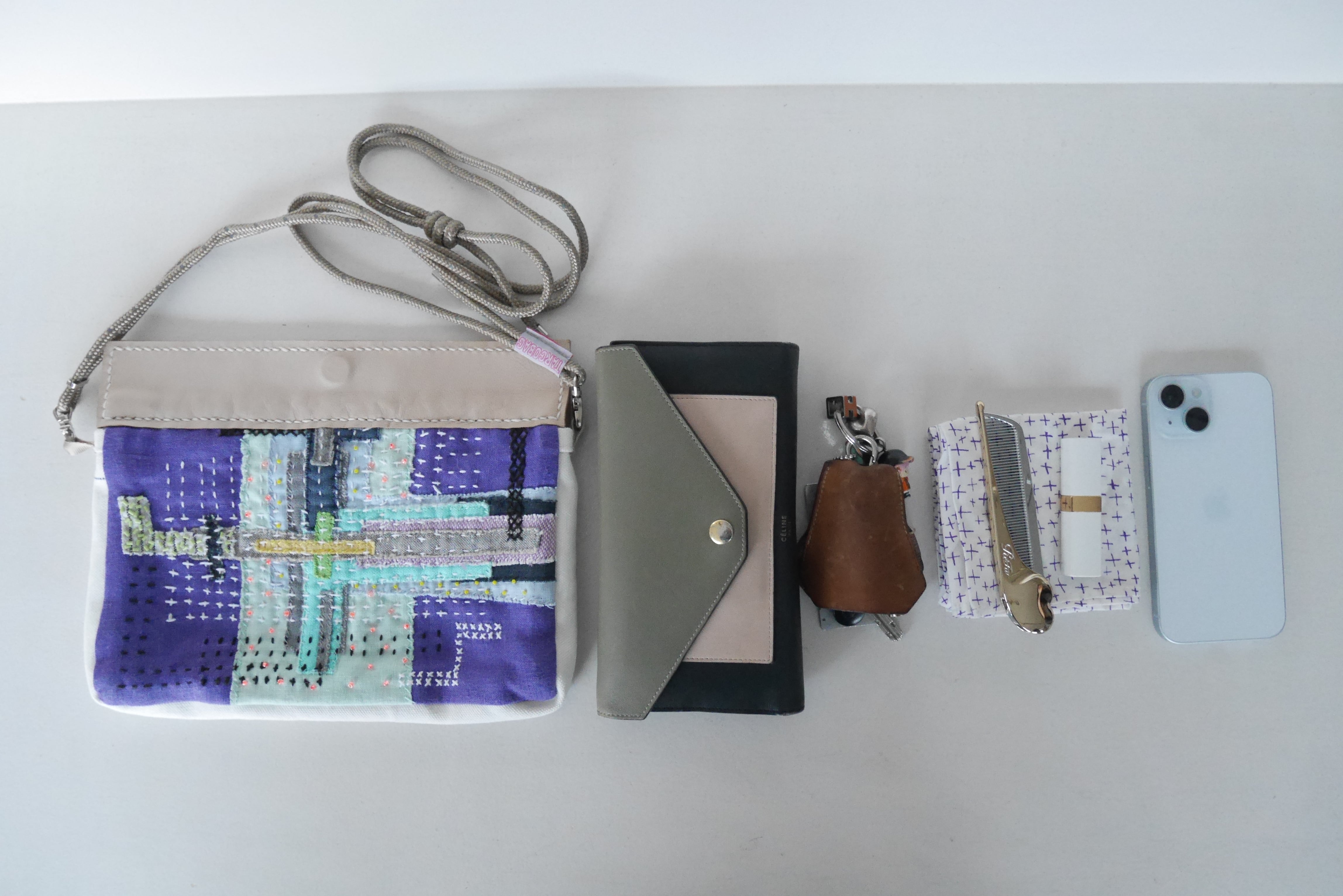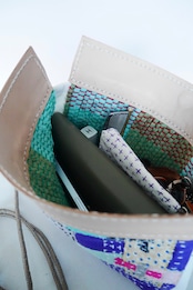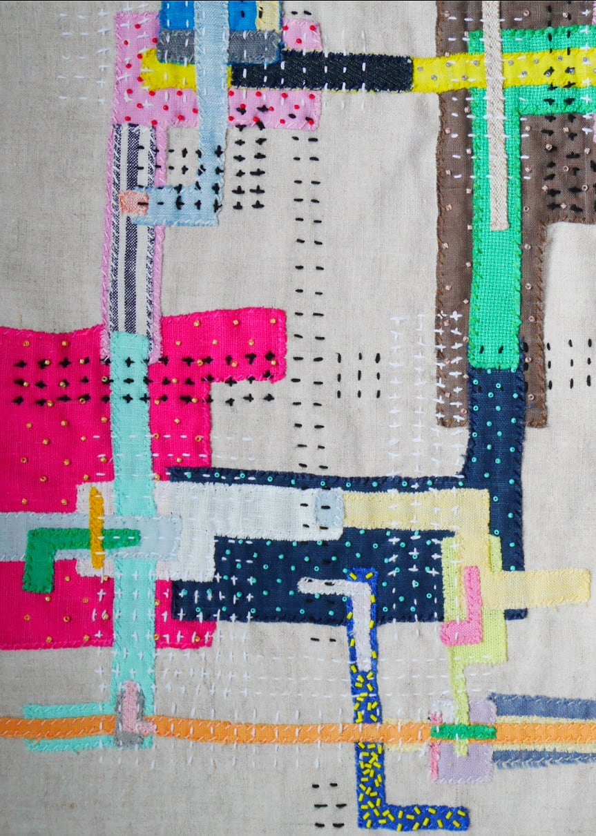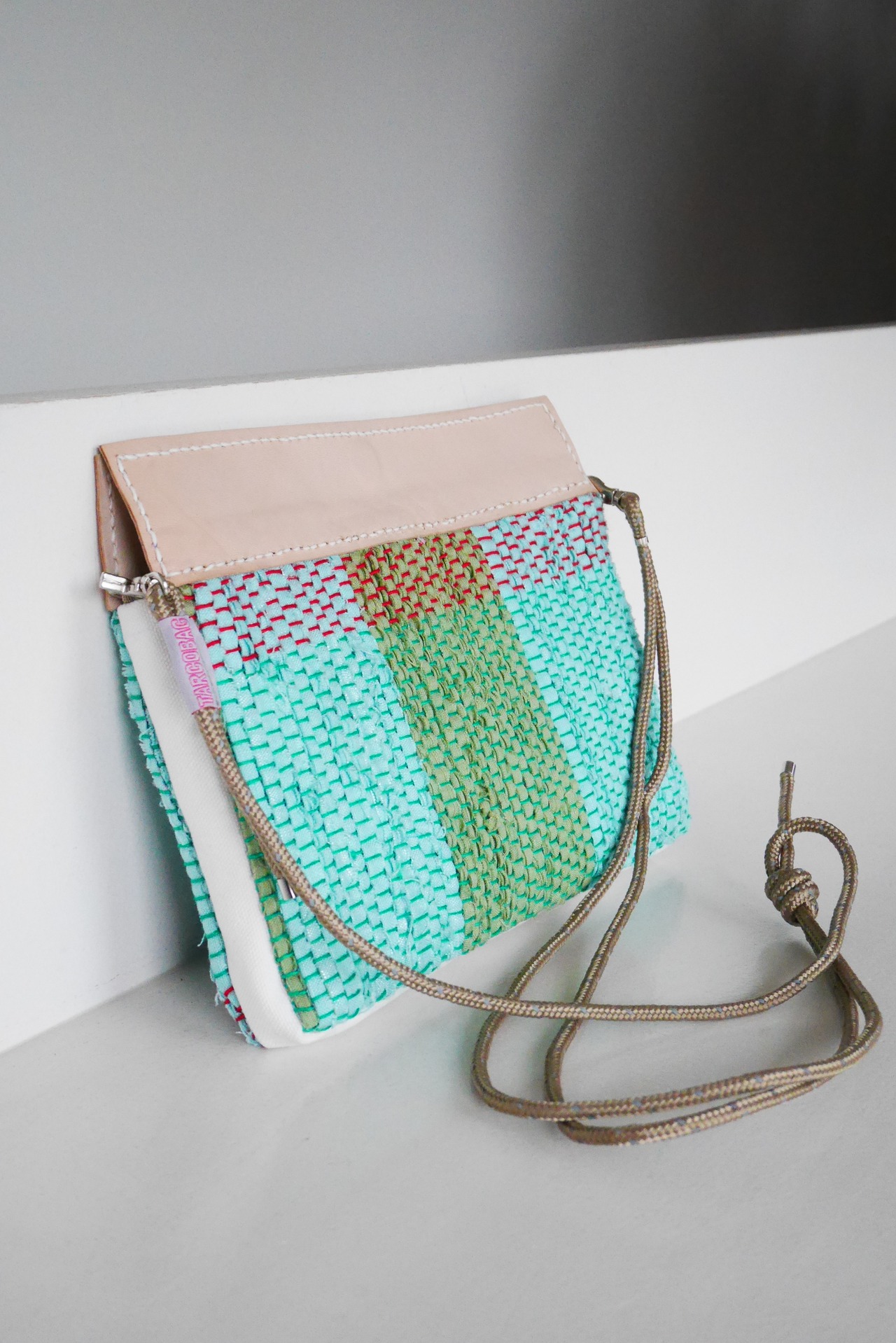 リネン、キャンバス、レザー、ビーズ、そしてTARCO独自の布の断片を重ね