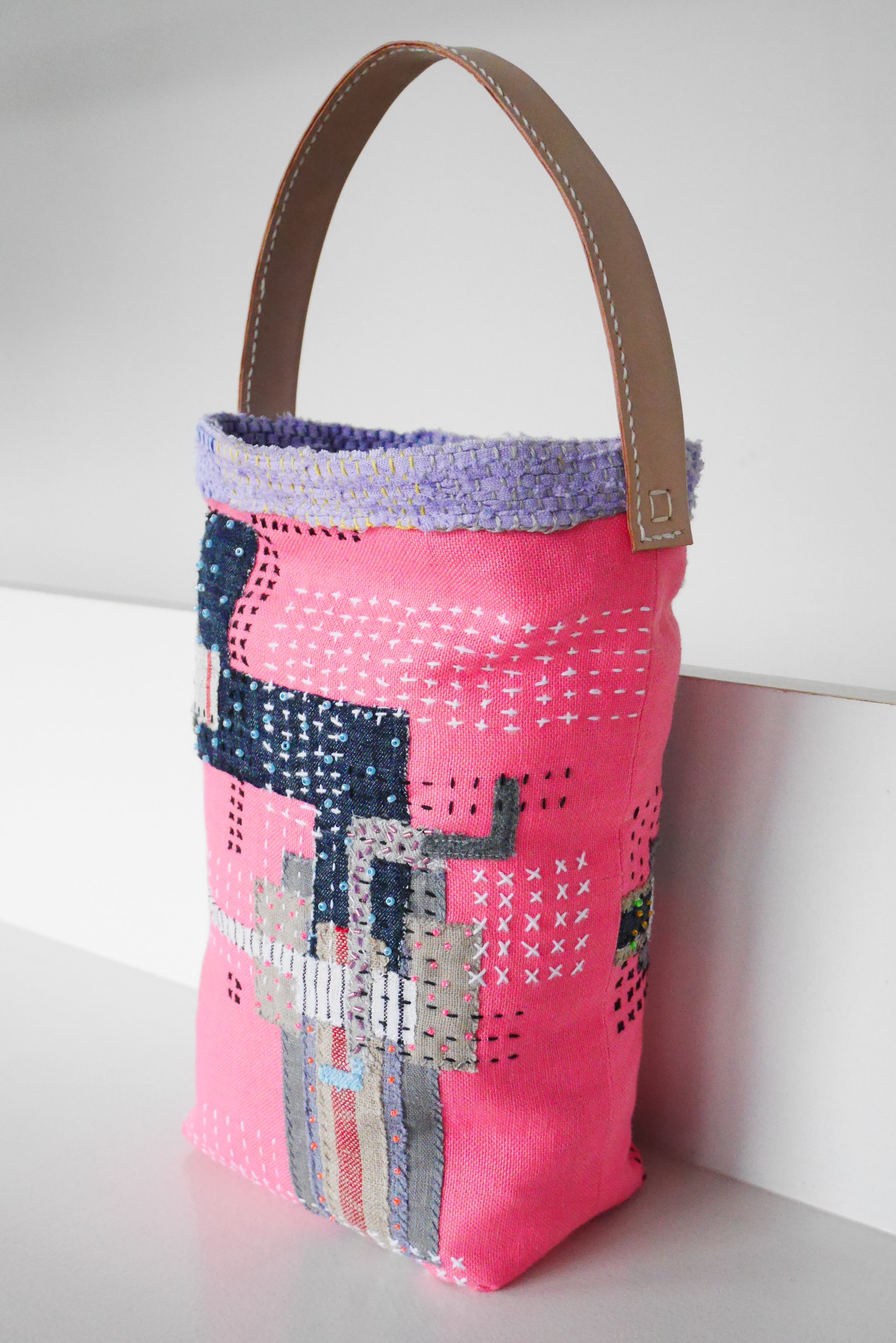 Materials:linen fabric, handwoven sakiori, leather, glass beads